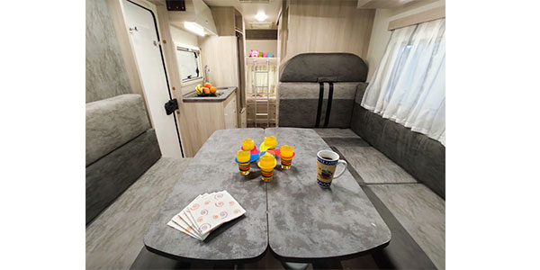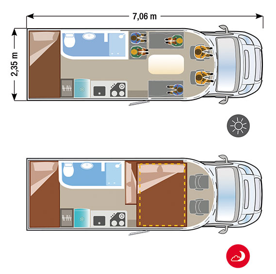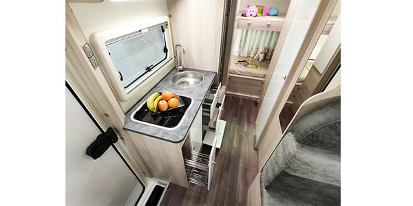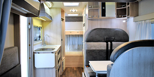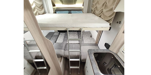 Autocaravana perfilada con 6 plazas para viajar y dormir. Vehículo muy versátil, espaciosa zona de salón/comedor, práctica cocina lineal y baño muy espacioso con ducha independiente. Cuenta con 2 literas en la parte trasera y una amplia cama elevable en la zona del salón. Garaje de acceso por ambos lados.